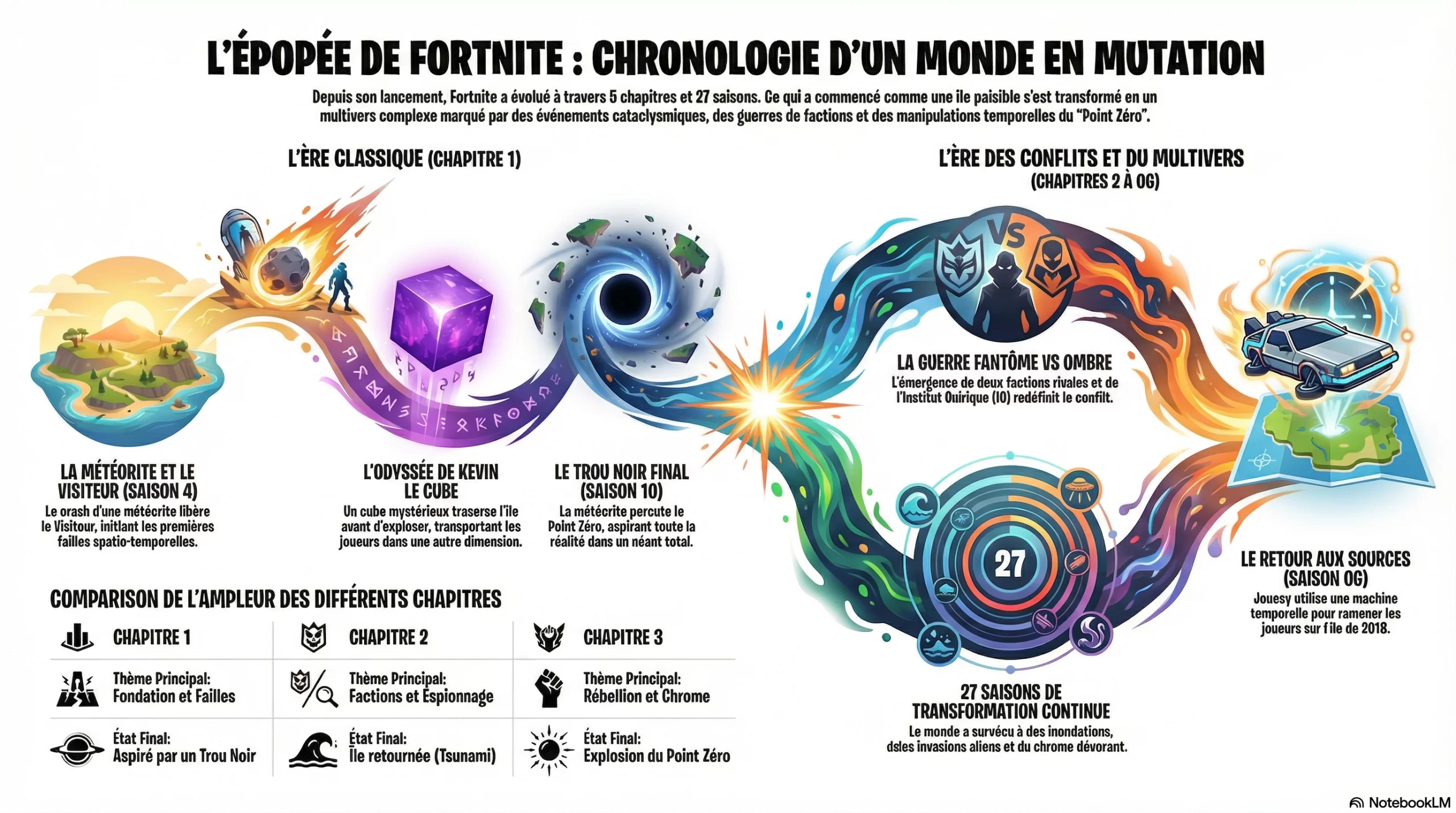 L’histoire de Fortnite se déroule à travers plusieurs chapitres marqués par la lutte pour le contrôle du « Point Zéro », une source d’énergie instable située au cœur de l’île,.